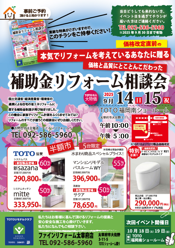 ◆開催場所: TOTO福岡南ショールーム 住所:太宰府市大佐野3-11-1