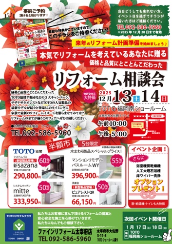 住まいに関するお悩みや、夢をお持ちの皆様へ。ファインリフォームでは、「親切が第一」をモットーに、お客様一人ひとりに寄り添うリフォーム相談会を、TOTO福岡南ショールームにて開催いたします。