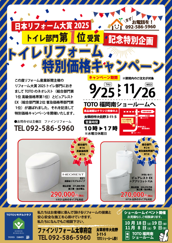 トイレリフォーム特別価格キャンペーン 日本リフォーム大賞2025トイレ部門に おきましてTOTOのネオレストが第1位に 選ばれました。 それを記念しまして トイレリフォーム特別価格キャンペーンを 開催致します。 TOTO史上最高傑作「ネオレスト」を ご自宅に設置してみませんか? 施工費・処分費・消費税込の価格です。 宜しくお願い致します。