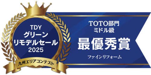 「TOTOリモデルセール2025年」TOTO部門ミドル級におきまして最優秀賞を頂きました!!優秀賞は何度か頂いたことがありましたが1位(最優秀賞)は初めてで大変光栄なことだと喜んでいます。工事をさせて頂いたお客様、工事にかかわって頂いた職人さんに感謝です。これを励みに地道な努力を続けていきたいと思います。引き...