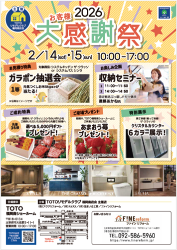 今年最後のリフォーム相談会です。2026年もリフォーム補助金が継続されます!!さらにTOTOのお得なキャンペーンも始まりました!!この機会に来年のリフォーム計画を立ててみては!!年末でお忙しいとは思いますが多数のお客様のご来場をお待ちしています!!